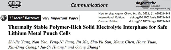 相关研究成果以“Thermally Stable Polymer-Rich Solid Electrolyte Interphase for Safe Lithium Metal Pouch Cells”为题发表在Angew. Chem. Int. Ed.上。