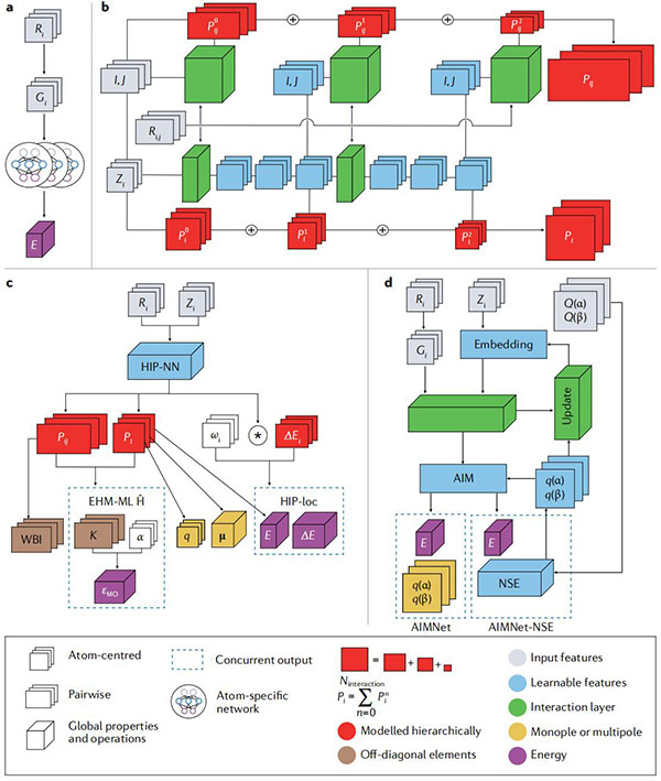 (c)HIP-NN变体用于学习不同的原子和分子性质;