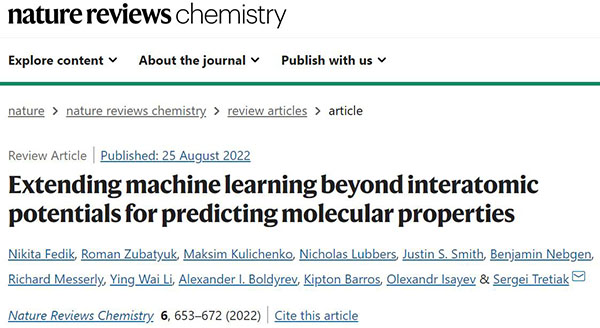 文献链接:“Extending machine learning beyond interatomic potentials for predicting molecular properties”(Nature Reviews Chemistry,2022,10.1038/s41570-022-00416-3)