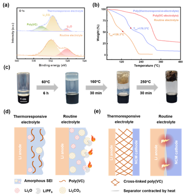 图3 热响应电解质的热稳定性。(a)不同电解质中循环Li的XPS O 1s谱。(b)不同电解质的热重分析。(c)不同温度加热前后热响应电解质照片。(d)热响应电解质在热失控过程中延长时间;(e)作用机制示意图。