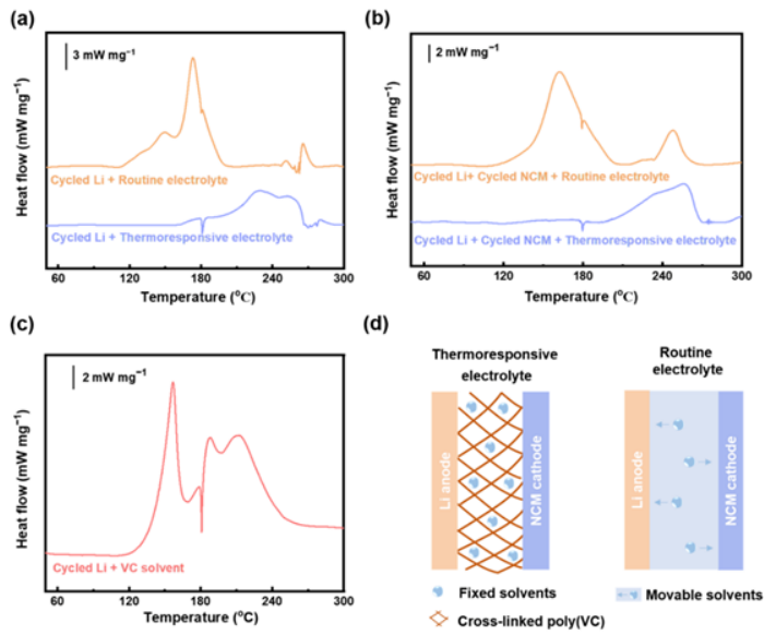 图4 不同电解质对电池组件热行为的影响。(a)循环Li和(b)循环Li +循环NCM与不同电解质的DSC曲线。(c) VC溶剂中循环Li的DSC曲线。(d)热响应电解液提高LMBs热失控过程的作用机理示意图。
