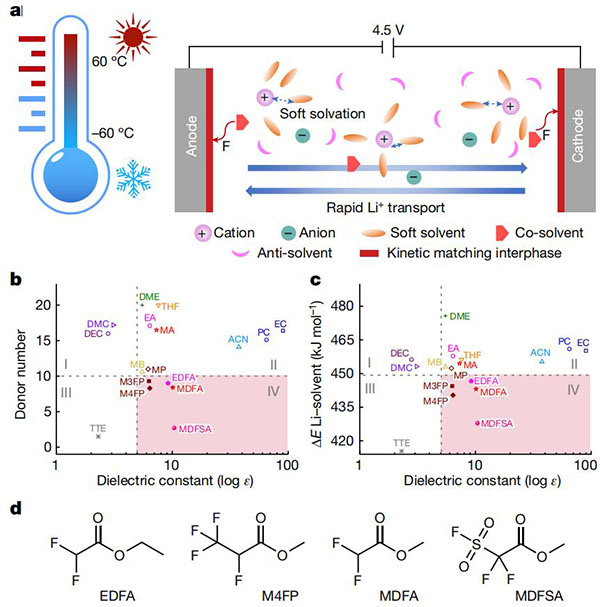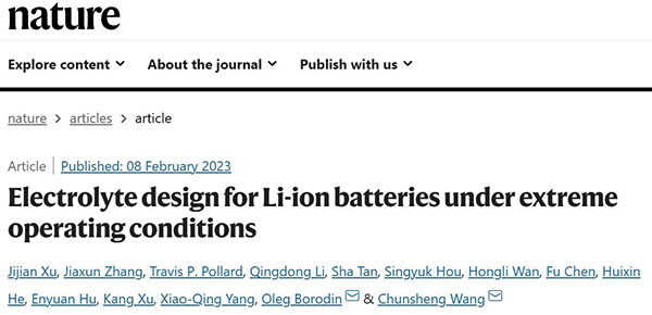 相关研究成果以“Electrolyte design for Li-ion batteries under extreme operating conditions”为题发表在Nature上。
