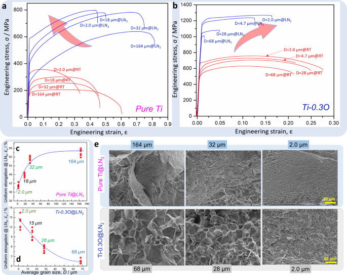 图2 不同晶粒尺寸纯Ti和Ti-0.3O合金的力学性能。a,纯Ti在室温(红色曲线)和液氮温度(蓝色曲线)下的工程应力-应变曲线; b Ti-0.3O在室温(红色曲线)和液氮温度(蓝色曲线)下的工程应力-应变曲线; c, d Ti和Ti-0.3O在液氮温度下均匀拉伸率随晶粒尺寸的变化规律; e不同晶粒度纯Ti和Ti-0.3O在液氮温度下的端口形貌。© 2022 The authors