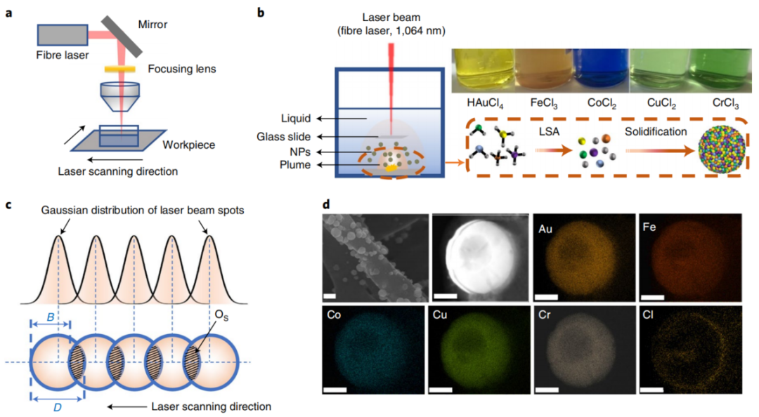 来自南京大学的姚颖方教授和邹志刚院士提出了一种简单通用的方法—激光扫描烧蚀(LSA)。在常规条件下合成了一系列高熵合金和陶瓷纳米颗粒。激光扫描烧蚀法在室温温度和常规大气压强下可以烧蚀相应的纳米颗粒,仅需5纳秒脉冲激光。其主要原理是将能量聚集在微米级的局域范围内,将金属前驱体混合物烧蚀形成纳米颗粒。超快的过程可以确保即使热力学不相容的不同金属元素结合。将制备的高熵材料纳米颗粒作为电催化剂用于水分解,其过电位可达185mv @ 10ma cm-2。这种通用的策略制备的HEM NPs可以应用于一系列领域,如生物医学,催化,能量存储和传感器。该工作以“General synthesis of high-entropy alloy and ceramic nanoparticles in nanoseconds”为题发表在Nature出版社的新期刊Nature Synthesis。