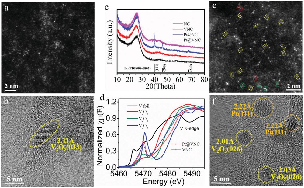 图1 材料的形态和结构表征。a) VNC和Pt@VNC的HAADF-STEM图像,b) VNC和(f) Pt@VNC的HRTEM图像,c) 四种催化剂的XRD图谱,d) 在V k-edge催化剂的归一化XANES。e) Pt-V配对用黄色虚线框表示,Pt-Pt配对用绿色虚线框表示,Pt-V – Pt三原子用红色虚线框表示。© 2023 Wiley
