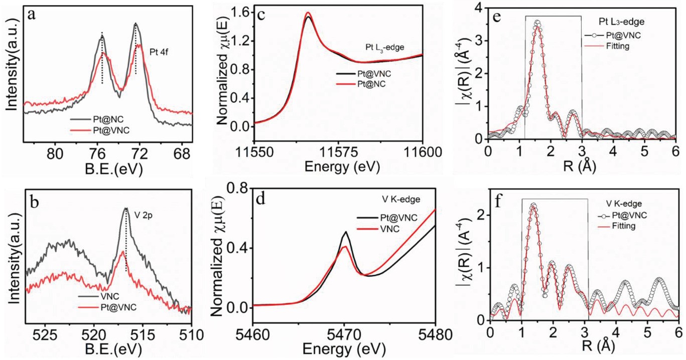 图2 使用XPS, XANES和EXAFS进行结构表征。a) Pt@NC和Pt@VNC的Pt 4f XPS光谱,b) VNC和Pt@VNC的V 2p XPS光谱,c) Pt@VNC和Pt@NC的Pt L3-edge以及d) VNC和Pt@VNC的V K-edge 归一化 XANES, Pt@VNC e) Pt L3-edge和(f) V K-edge的EXAFS拟合结果。© 2023 Wiley