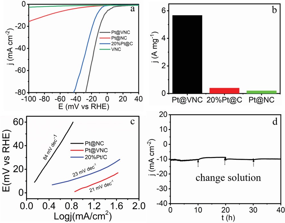 2、基于单原子和团簇的协同效应,Pt@VNC显示出优异的HER催化效率和稳定的耐久性。在10 mA cm-2的电流密度下,它只需要5 mV的过电势。并且显示出比商业20wt % Pt/C催化剂约大15倍的质量活性。