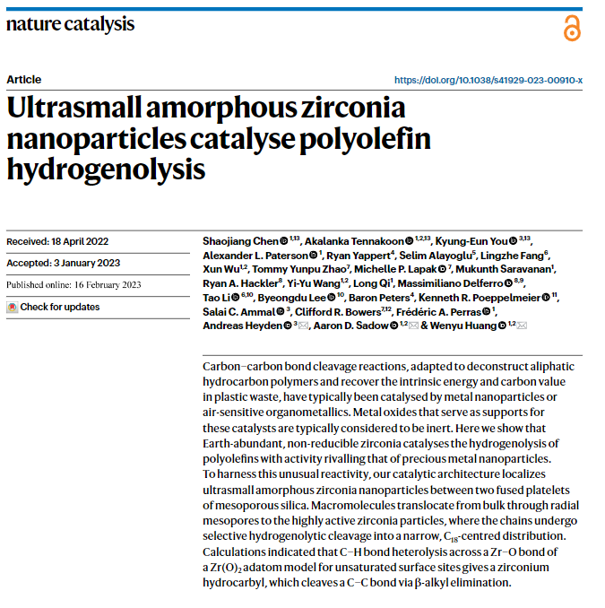 近日,爱荷华州立大学Wenyu Huang、Aaron D. Sadow以及南卡罗来纳大学Andreas Heyden等人发现并证明地球上含量丰富的、不可还原的超小无定形氧化锆能够催化聚烯烃的氢解,其活性与贵金属纳米颗粒相当。相关的研究成果以“Ultrasmall amorphous zirconia nanoparticles catalyse polyolefin hydrogenolysis”为题发表在Nature Catalysis上。