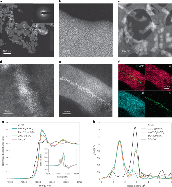 图2 ZrO2催化剂的电子显微镜和X射线吸收光谱表征。L-ZrO2 @mSiO2的低倍率 ( a ) 和高倍率 ( b ) 高角度环形暗场 (HAADF) STEM 图像。通过显微切片制备的L-ZrO2 @mSiO2颗粒横截面的低倍率( c )和高分辨率( d )HAADF STEM 图像。高倍 HAADF STEM 图像( e )和相应的能量色散X射线光谱元素映射。L-ZrO2 @mSiO2和对照样品的归一化 Zr k-edge X 射线吸收近边结构光谱 ( g ) 和k2-weighted 的EXAFS 光谱( h )。©2023 The Author(s)