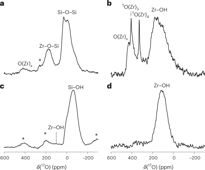 图3 ZrO2催化剂的固态 NMR 光谱。L-ZrO2 @mSiO2 ( a ) 和单斜ZrO2-30纳米颗粒( b )的直接 DNP 增强17O Hahn回波光谱。 L-ZrO2 @mSiO2 ( c ) 和ZrO2-30纳米颗粒( d )的间接DNP 增强的17O{1H} PRESTO NMR光谱。©2023 The Author(s)