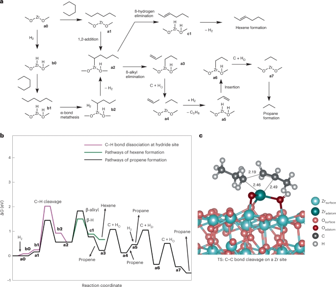 图6 碳氢化合物氢解的计算机理模型。(a)Zr(O)2 /m-ZrO2和 H–Zr(O)(OH)/m-ZrO2模型上考虑的正己烷氢解反应路径示意图。(b)相应的自由能曲线。(c)为 C-C 键解离计算的过渡态。 ©2023 The Author(s)
