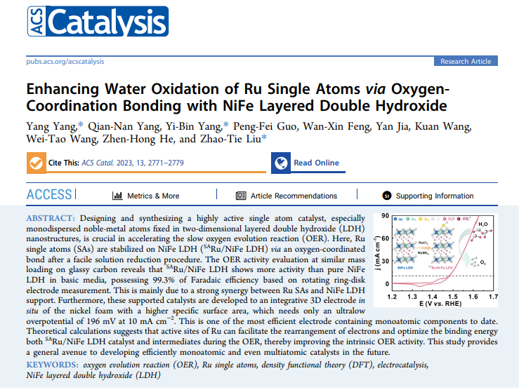 近日,陕西HTH官网地址 大学刘昭铁教授团队成功通过氧配位将Ru SAs分散固定在二维层状NiFe双氢氧化物纳米结构上(表示:SARu/NiFe LDH)。SARu/NiFe LDH展现出出色的整体OER性能。相关的研究成果以“ Enhancing Water Oxidation of Ru Single Atoms via Oxygen-Coordination Bonding with NiFe Layered Double Hydroxide”为题发表在ACS Catalysis上。