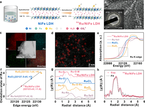 图1 SARu/NiFe LDH的合成工艺及材料表征。(a)合成过程说明。(b) HRTEM图像和SAED图。(c) HAADF-STEM图像和相应的Ni、Fe、Ru的初等映射。(d) AC-STEM图像(Ru单个原子用红圈标记)。(e) SARu/NiFe LDH和参考样品的Ru k-edge XANES光谱。(f) 不同Ru样品中Ru K-edge的XANES光谱得到的Ru价态。(g)来自(e)的FT- EXAFS光谱。(h) EXAFS R -空间拟合。© 2023 ACS publication
