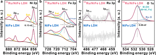 图2两种LDH样品的XPS, (a) Ni 2p,(b) Fe 2p,(c) Ru 3p和(d) O 1s。 © 2023 ACS publication