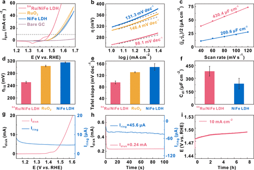 图3 SARu/NiFe LDH、NiFe LDH和商业RuO2粉末在碱性介质中的OER活性。(a)经IR校正的CV。(b) Tafel图。(c) Cdl。三种改性电极的(d)η10、(e) Tafel斜率和(f) Cdl的误差值。误差条是至少三次实验的标准差。(g)在RRDE上SARu/NiFe LDH的盘电流和环电流。(h) SARu/NiFe LDH的法拉第效率测试。(i) SARu/NiFe LDH在10 mA cm-2下超过8小时的电化学耐久性测试。催化剂用量:~ 130 μg cm–2。© 2023 ACS publication