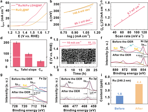 图4 SARu/NiFe LDH@NF电极的OER性能和稳定性。(a)IR校正的LSV曲线。(b) Tafel图。(c) Cdl。(d) η10、Tafel斜率和Cdl的误差值。(e) SARu/NiFe LDH@NF在恒定10 mA cm-2下超过24小时的稳定性测量;插图表示OER测量前后的SEM图像。SARu/NiFe LDH@NF电极电化学稳定性测量前后的XPS((f) Ni 2p、(g) Fe 2p和(h) Ru 3p)。(i) OER 测试前后基本介质中金属 Ru的ICP-AES数据。© 2023 ACS publication