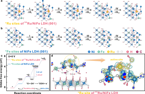 图5 两种LDH催化剂(001)面的理论计算。(a) SARu/NiFe LDH和(b) NiFe LDH材料的结合四电子OER机制图。(c) SARu/NiFe LDH的Ru位和NiFe LDH的Fe位的吉布斯自由能图;*Ru、*Fe为活性位。(d) SARu/NiFe LDH与Ru位点的电荷密度差异。铬黄和青色等高线分别代表电子的增益和损失。© 2023 ACS publication