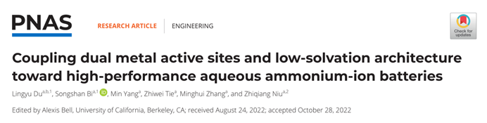 相关研究成果以“Coupling dual metal active sites and low-solvation architecture toward high-performance aqueous ammonium-ion batteries”为题发表在国际著名期刊PROCEEDINGS OF THE NATIONAL ACADEMY OF SCIENCES OF THE UNITED STATES OF AMERICA上。