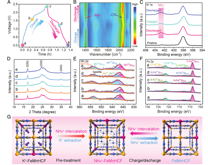 (G)FeMnHCF阴极中NH4+离子存储过程示意图;