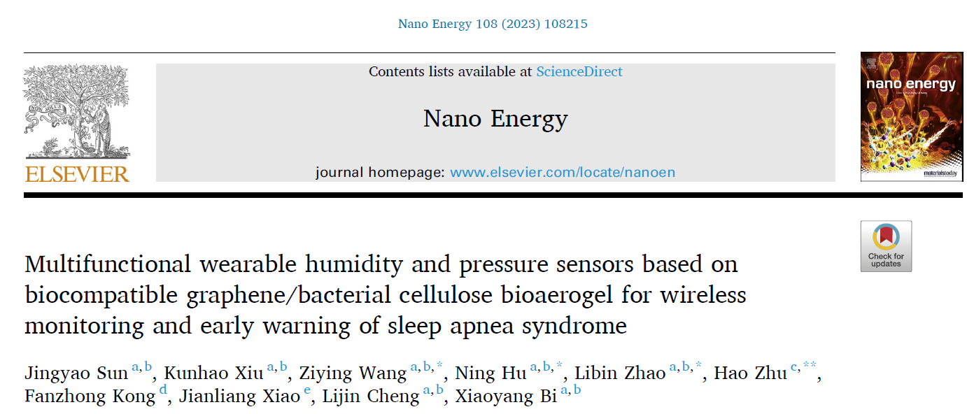 相关工作以“Multifunctional wearable humidity and pressure sensors based on biocompatible graphene/bacterial cellulose bioaerogel for wireless monitoring and early warning of sleep apnea syndrome” 为题发表在Nano Energy上。河北工业大学机械工程学院博士研究生孙敬尧为第一作者,2019年本科毕业于兰州理工大学,目前研究方向为可穿戴柔性传感器,植入式生物可兼容柔性传感系统,无线柔性传感电路设计。