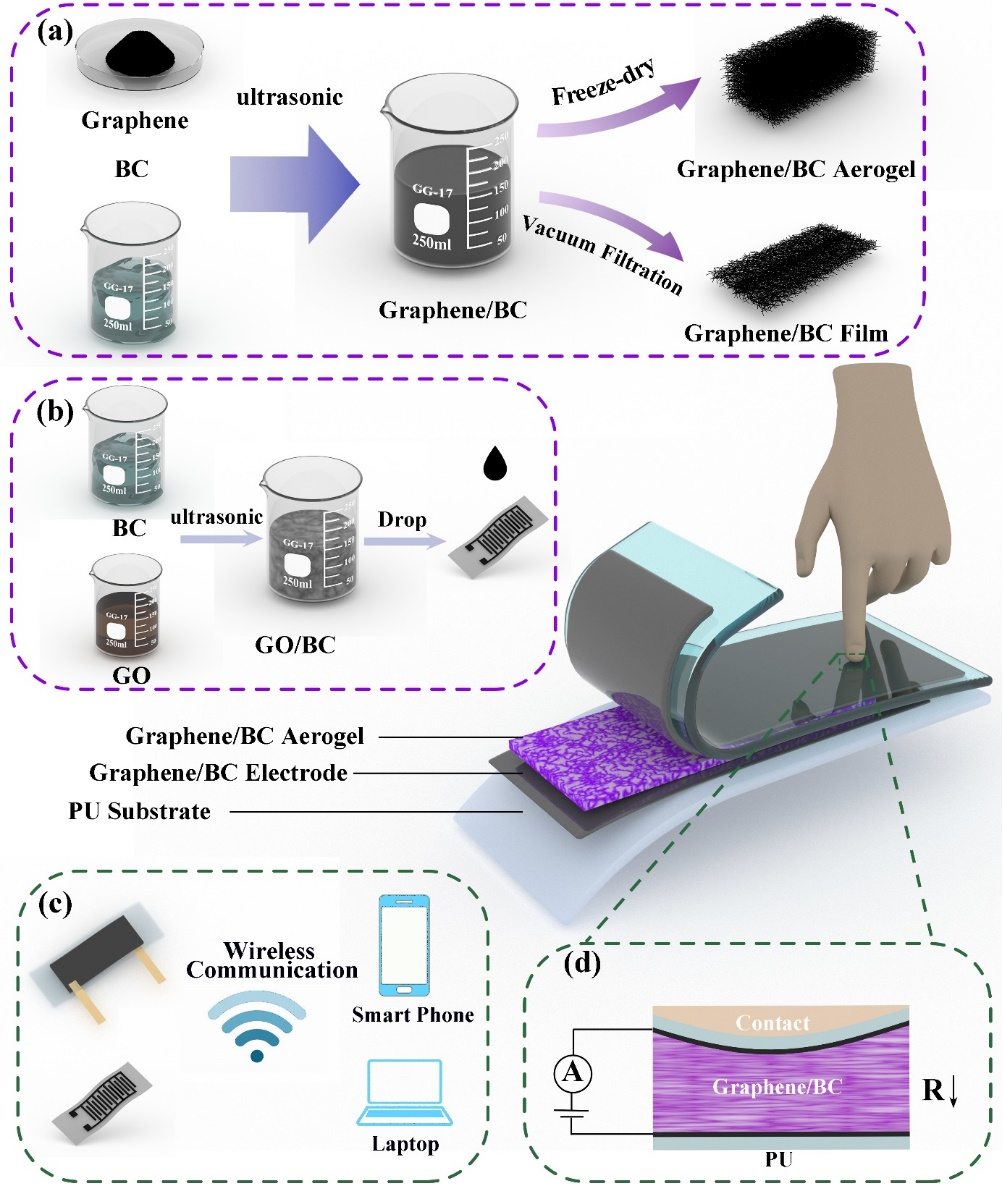 图1 基于石墨烯/细菌纤维素复合材料的压力/湿度多功能柔性无线传感平台