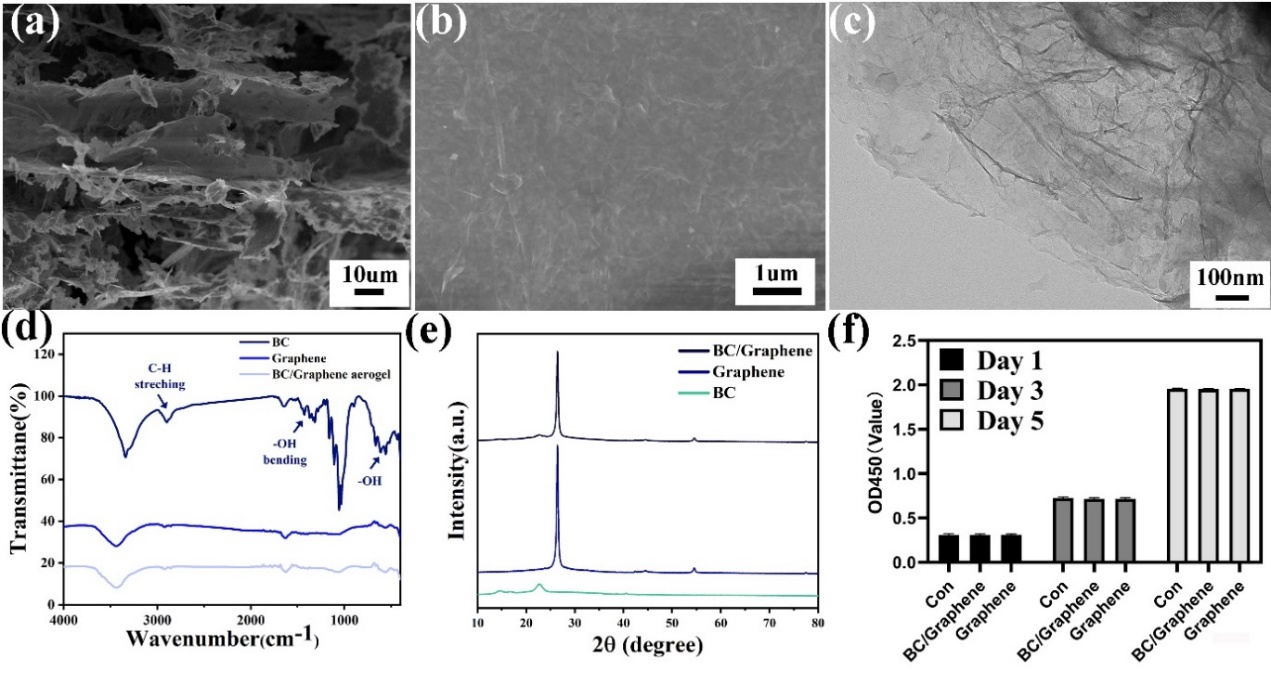 石墨烯纳米片在细菌纤维素的支撑下形成多孔结构,为压力传感提供了良好的形变能力(图2)。细胞毒性实验表明,石墨烯/细菌纤维素生物气凝胶具有生物兼容性。