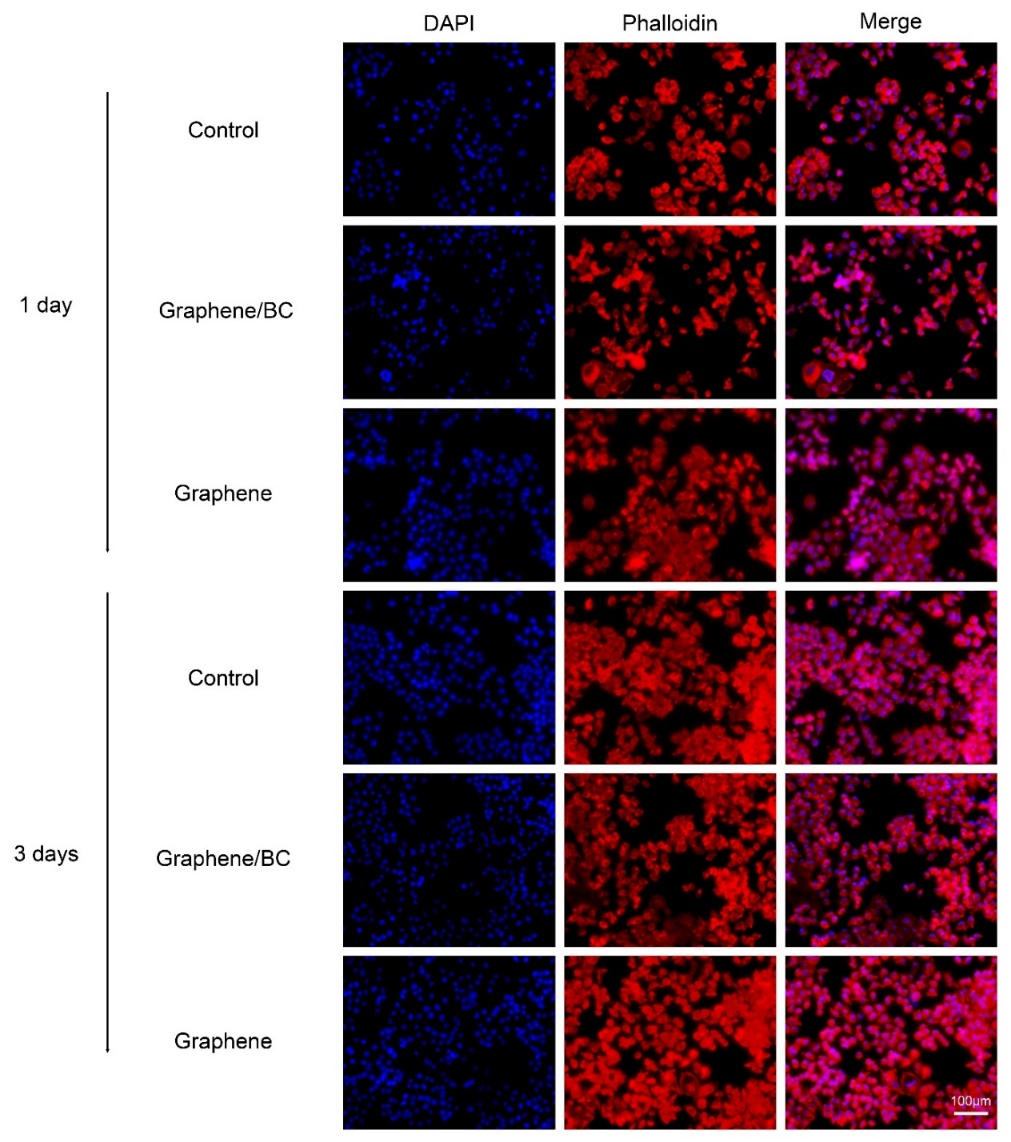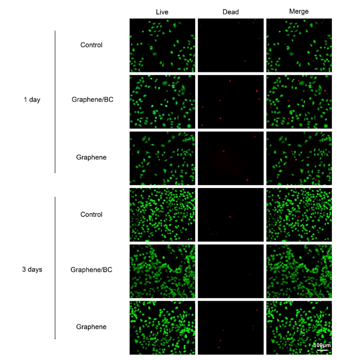 使用活/死染色试剂盒鉴定石墨烯/BC和石墨烯的细胞毒性(图4)。在初始阶段,各组细胞行为无明显差异。经过1天和3天的培养,在石墨烯/细菌纤维素和石墨烯上仅检测到少量死亡细胞,说明石墨烯/BC和石墨烯具有较高的生物相容性。