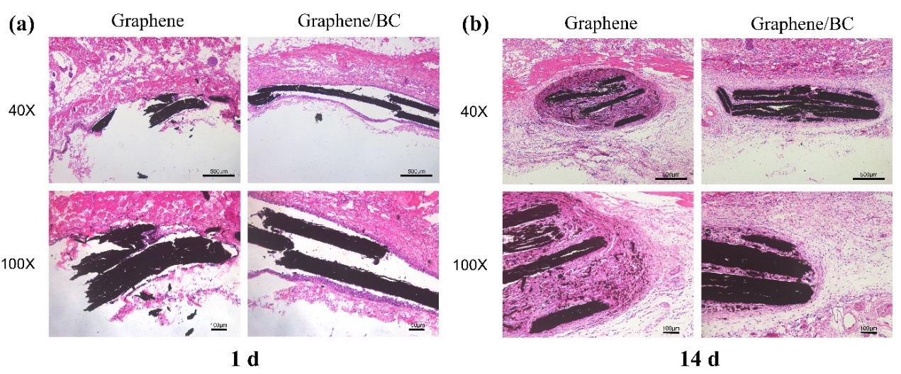进行皮下植入以评估体内生物反应(图5)。植入1天后,样品周围几乎没有生物反应。但在植入14天后,与石墨烯/细菌纤维素相比,石墨烯保持了较厚的层状结构,说明细菌纤维素的加入显著降低了石墨烯在体内引起的炎症反应。