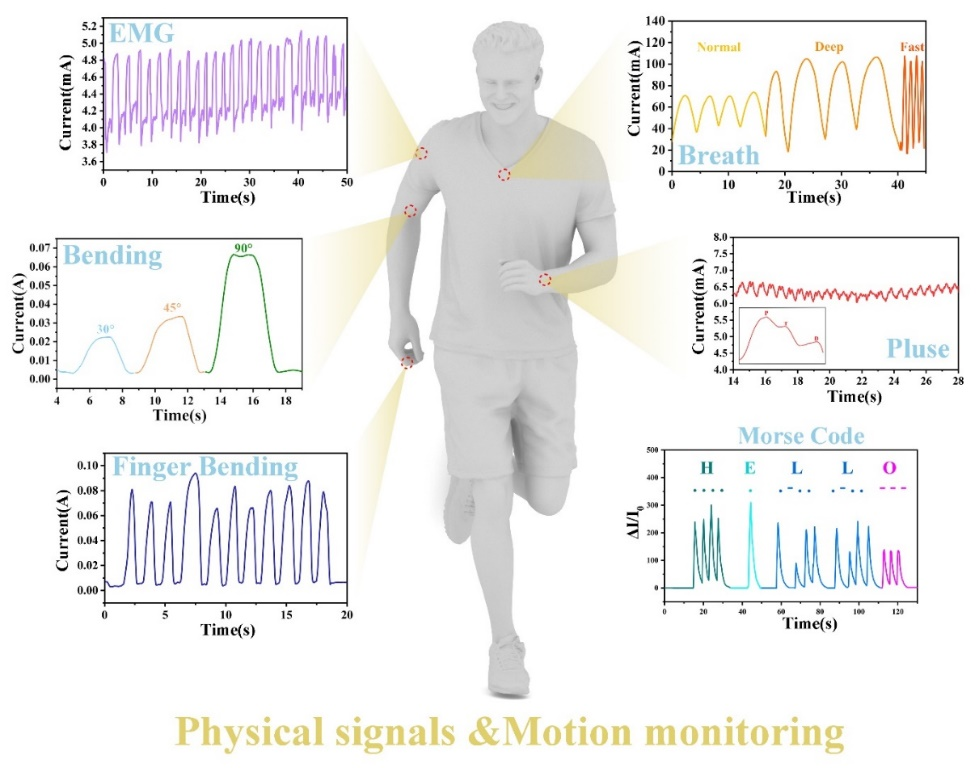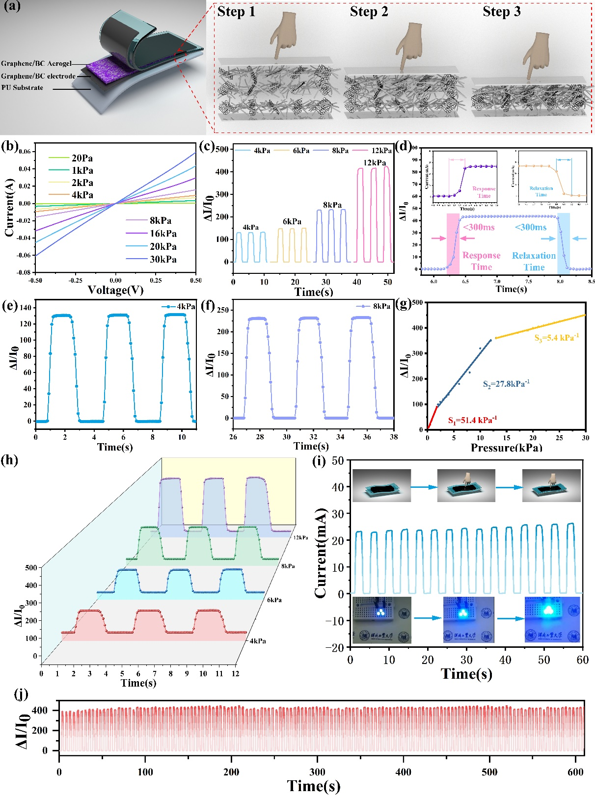 为了研究压力传感特性,通过将石墨烯/细菌纤维素气凝胶夹在粘附了石墨烯/细菌纤维素电极的PU薄膜之间来制造传感器。该传感器在各种外力刺激下显示出清晰稳定的响应/恢复行为,证实了其监测不同压力的能力(图6)。该器件显示出快速响应特性。进行了多次加载和卸载循环,响应迅速而稳定。基于石墨烯/细菌纤维素的柔性传感器能够实时检测人体健康特征(图7)。