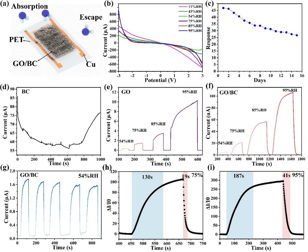 此外,氧化石墨烯/细菌纤维素复合材料制备出的湿度传感器也表现出较好的湿度响应。75%RH下响应恢复时间为130s和19s。