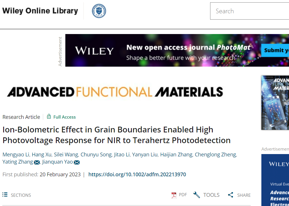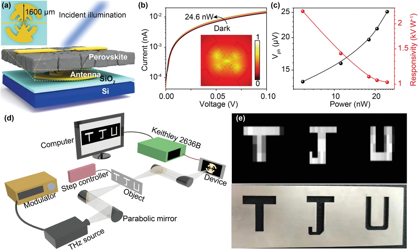 近日,天津大学姚建铨院士和张雅婷副教授设计了一种基于离子测辐射热效应的新型光电探测器,极大地提高了太赫兹探测器的响应性能。通过分析具有不同晶体结构的钙钛矿测辐射热计,并通过微纳尺度光电性能相关测试,合理化了晶界处广泛存在的缺陷态对电流响应的抑制。另一方面,晶界处的离子受到热激发能够补充因缺陷态损失的光电流,由于离子迁移产生的内建电场会随光热过程的强度产生周期性变化。据此,我们首次报道了基于离子测辐射热效应的钙钛矿探测器,对红外和太赫兹波可实现kV/W的高响应。同时,基于离子辐射热效应的探测器展示出进行大面积成像应用的潜力。相关成果以“Ion-Bolometric Effect in Grain Boundaries Enabled High Photovoltage Response for NIR to Terahertz Photodetection”为题发表在国际顶级期刊Advanced Functional Materials上。