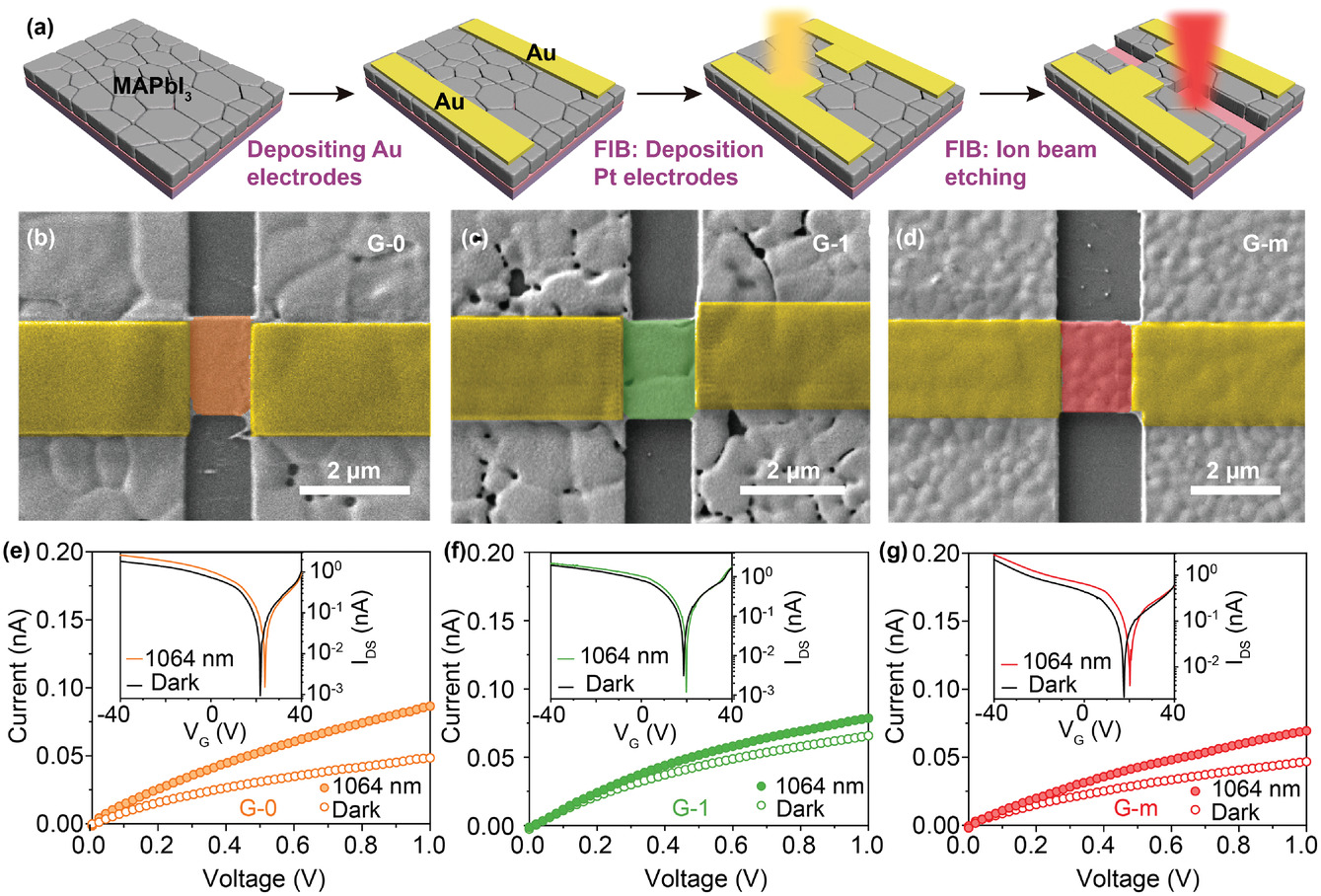 图1 (a)制备钙钛矿辐射热计的FIB原理图。(b-d)不同类型的辐射热计的SEM图像。(e-g)暗态和1064 nm光照下的电流-电压(I-V)曲线。 ©2023 Wiley-VCH Verlag