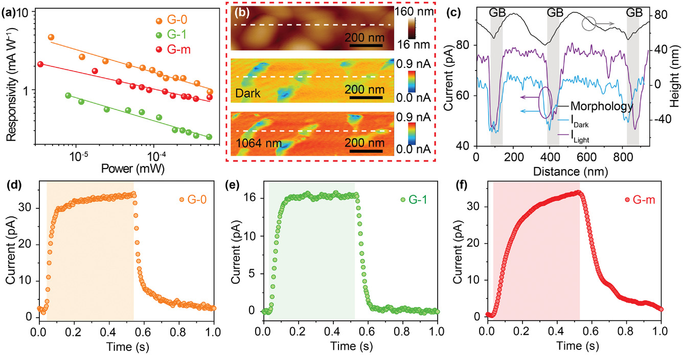图2 (a)不同类型的辐射热计的电流作为1064nm功率强度的函数。(b)MAPbI3的 CAFM测量结果。(c)CAFM图中白色虚线对应的电流和高度图。(d-f)不同类型的辐射热计随周期变化的光电流响应特征曲线。 ©2023 Wiley-VCH Verlag