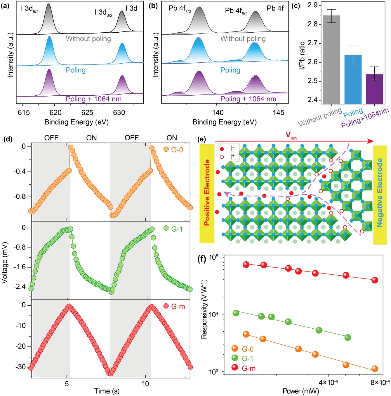 图3 电极化及叠加光极化后,薄膜表面(a)I 3d和(b) Pb 4f的XPS峰,以及I/Pb比值。(d)不同类型的辐射热计随周期变化的1064nm激光,产生的光电流响应特征曲线。(e)离子-测辐射热效应示意图。(f)不同类型的辐射热计的电压响应度作为1064nm功率强度的函数。 ©2023 Wiley-VCH Verlag
