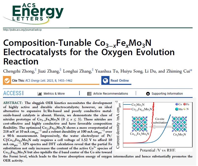近日,华南理工大学崔志明教授团队成功开发了一种具有η-碳化物型结构的新型Co3-xFexMo3N (0≤x≤3)电催化剂。该催化剂具有良好的组成灵活可调性,可作为高效、耐用的OER电催化剂。相关的研究成果以“Composition-Tunable Co3–xFexMo3N Electrocatalysts for the Oxygen Evolution Reaction”为题发表在ACS Energy Letters上。
