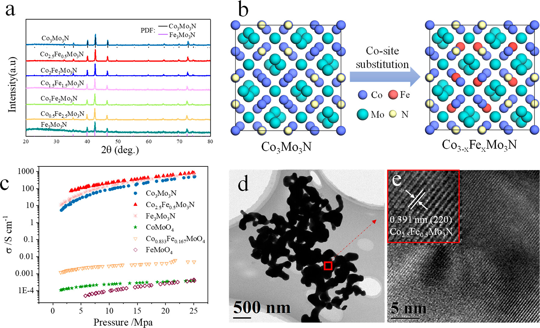 图1 (a) Co3– xFexMo3N的X射线衍射图。(b) Co3– xFexMo3N (0 ≤ x ≤ 3)的Co位点的部分取代方案. (c) Co3Mo3N、Fe3Mo3N、Co2.5Fe0.5Mo3N和相应的氧化物之间电子电导率的比较。(d, e) Co2.5Fe0.5Mo3N的TEM图像。© 2023 ACS publication