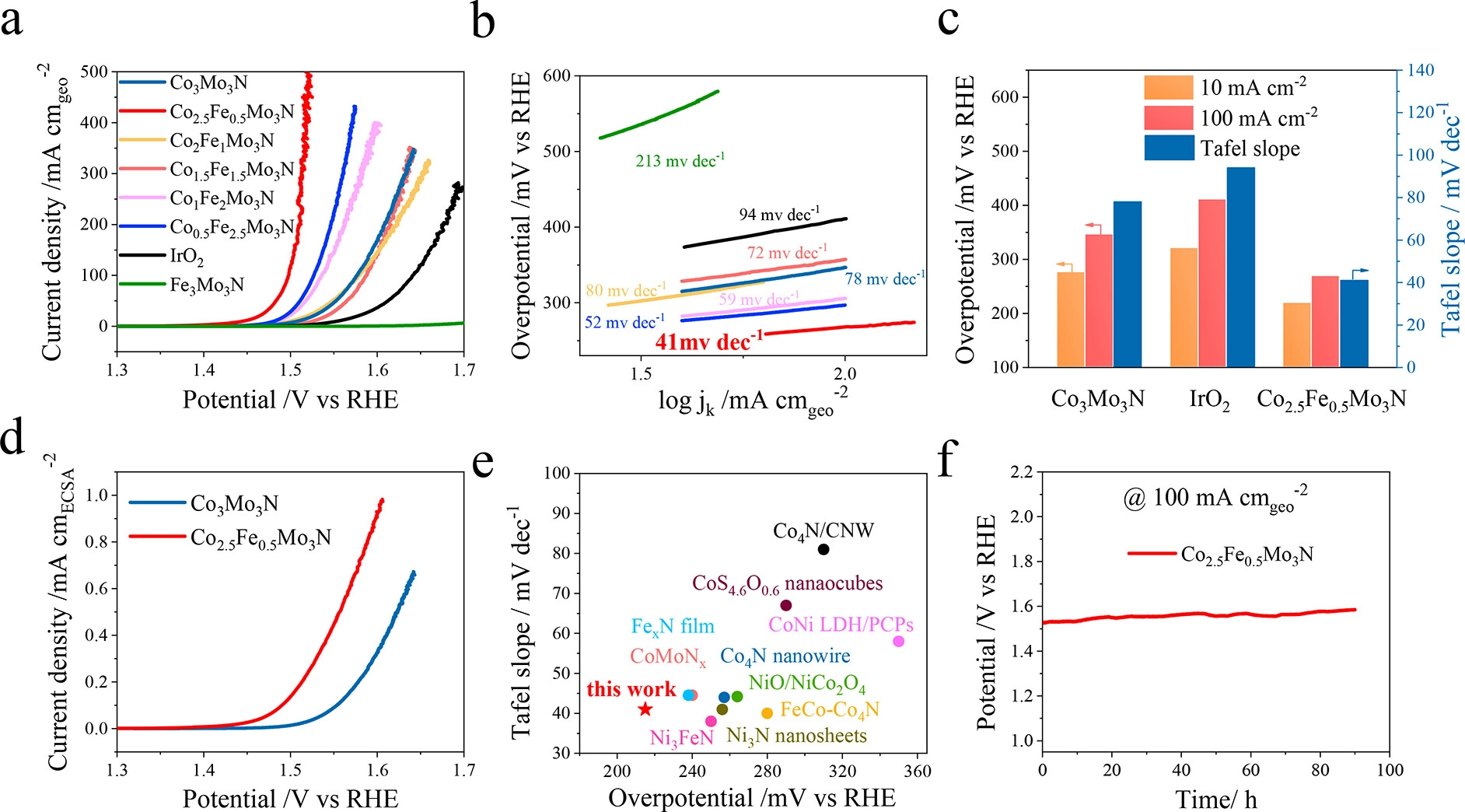 图2 (a) Co3– xFexMo3N和商业IrO2在O2饱和1.0 M KOH溶液中以1 mV s-1扫描速率测量的LSV和(b) Tafel图。(c) Co2.5Fe0.5Mo3N、Co3Mo3N和IrO2在10 mA cm-2和100 mA cm-2处的过电位以及Tafel斜率的比较。(d) Co3Mo3N和Co2.5Fe0.5Mo3N经ECSA归一化后的LSV曲线。(e) OER电催化剂的比较。(f) Co2.5Fe0.5Mo3N在100mA cmgeo-2电流密度下的计时电位曲线。 © 2023 ACS publication