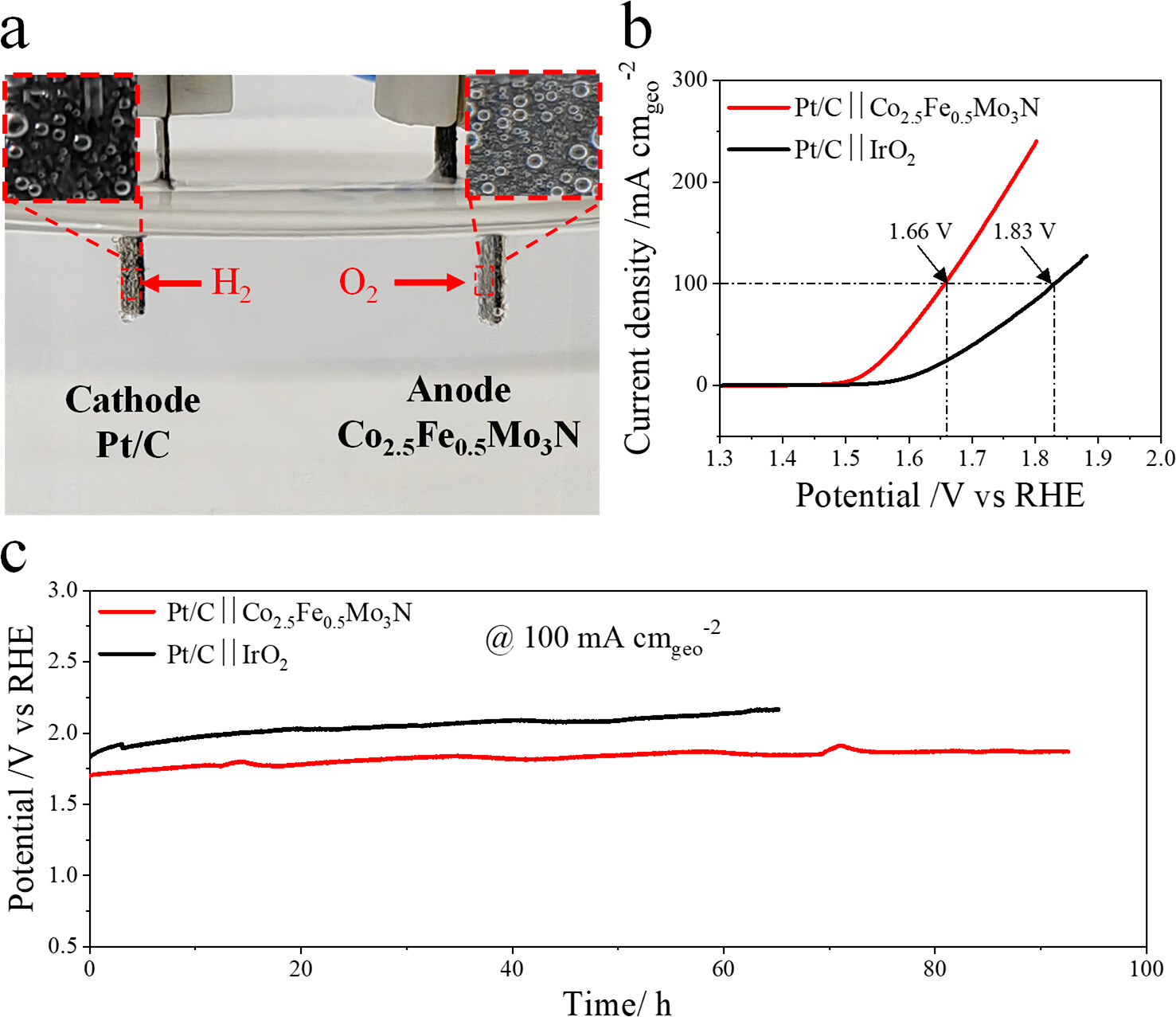 图3 (a)双电极系统的照片,分别在阴极和阳极产生H2和O2气泡。(b) Pt/C∥Co2.5Fe0.5Mo3N和Pt/C∥IrO2整体水分解极化曲线。(c)电流密度为100mA cmgeo-2时Pt/C∥Co2.5Fe0.5Mo3N和Pt/C∥IrO2的计时电位曲线。© 2023 ACS publication