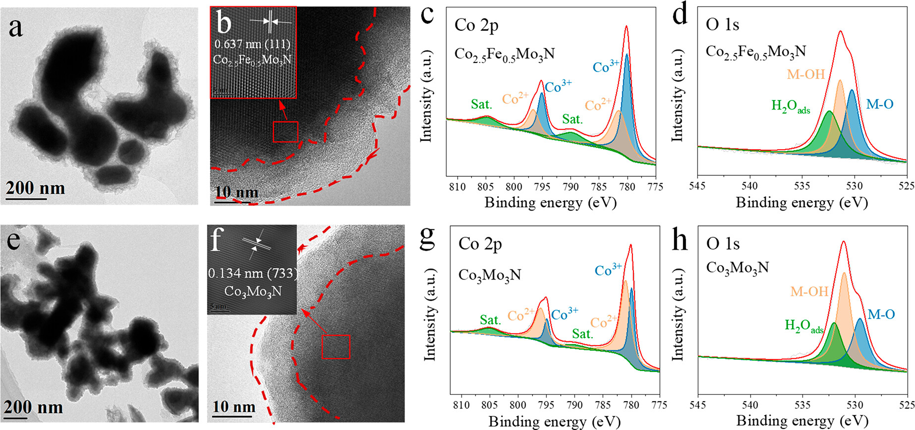 图4 (a, b) OER后Co2.5Fe0.5Mo3N的TEM图像。(c) OER后Co2.5Fe0.5Mo3N的Co 2p XPS 光谱。(d) OER后Co2.5Fe0.5Mo3N的O 1s XPS光谱。(e, f) OER后Co3Mo3N的TEM图像。(g) OER后Co3Mo3N的Co 2p XPS 光谱。(h) OER后Co3Mo3N的O 1s XPS光谱。© 2023 ACS publication