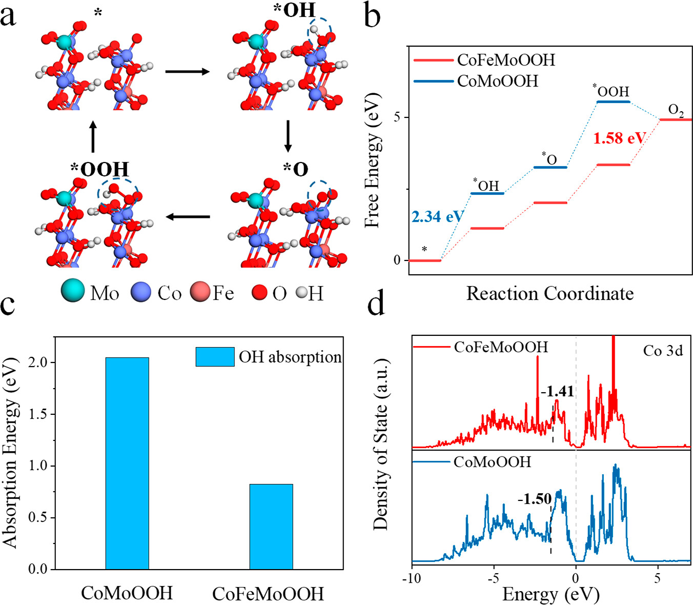 2、结合XPS和DFT计算发现,Fe取代部分Co位点不仅增加了Co2.5Fe0.5Mo3N表面活性组分的含量,同时导致Co位点的d带中心向费米能级上移,从而增强了氧中间体的结合强度,进一步降低了速率决定步骤的能垒。