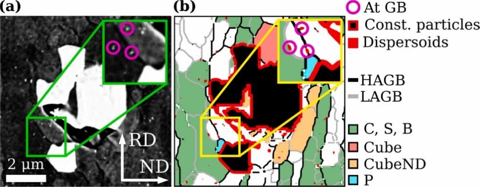 作者基于BSE和EBSD分析了多模态数据集,其中包含构成粒子和弥散相与(亚)晶粒和(亚)晶界的直接空间相关性。结果表明以下原因导致冷轧和非等温退火的Al-Mn合金中主要的P和CubeND再结晶织构和“同时析出”: