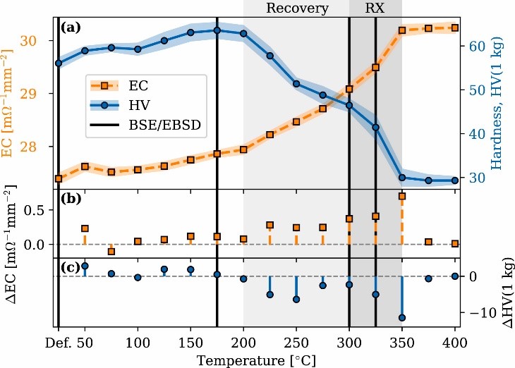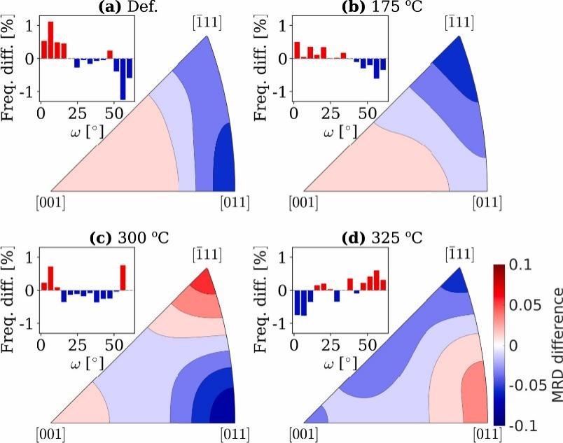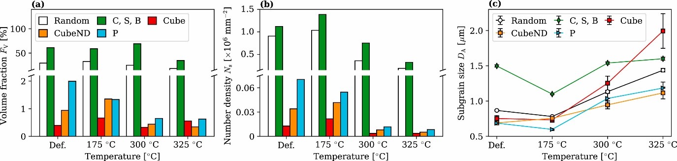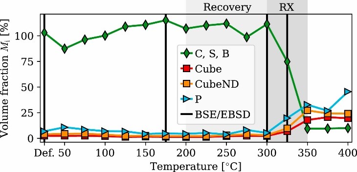 - 量化粒子在恢复和再结晶过程中对(亚)晶粒的取向依赖性影响,发现“同时析出”机制。与Al-Mn合金中的立方体织构相比,这些发现有助于深入了解强P和立方体ND织构背后的物理机制。