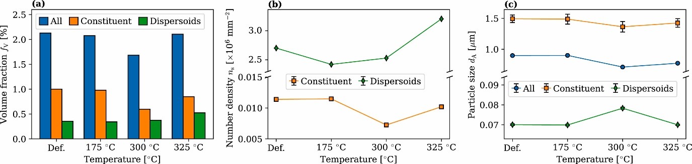 Al-Mn AA3xxx合金广泛用于饮料罐、汽车热交换器和包装等产品。热机械加工过程中调整其晶粒尺寸和结构是实现所需性能的关键。第二相颗粒通常在铸造过程中形成,高浓度合金元素可能会保留在固溶体中,并在后续热处理过程中发生沉淀。研究析出相行为对材料组织结构的影响至关重要。在热轧和冷轧后的退火过程中,大颗粒析出相(1µm)可能通过粒子激发成核(PSN)促进再结晶,而紧密排列的细弥散相(亚微米)可能通过Smith-Zener作用钉扎(亚)晶界延迟甚至抑制再结晶进度。如果颗粒在回复和再结晶之前或期间沉淀,弥散相通常会引起缓慢的再结晶动力学和粗大的晶粒。强PSN作用下最终再结晶织构通常较弱,但伴随颗粒析出。以往工作都是基于广泛间接的组织观察分别分析颗粒的密度和粒度方面微观化学以及粒度和织构方面的微观结构。对于如何量化析出粒子在回复和再结晶过程中对(亚)晶粒取向的影响,尚不清晰。