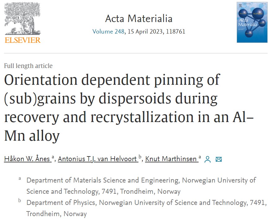 相关研究工作以“Orientation dependent pinning of (sub)grains by dispersoids during recovery and recrystallization in an Al–Mn alloy”为题刊登在金属材料旗舰期刊Acta Materialia上。