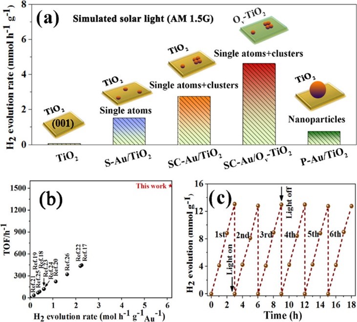 (a) 模拟太阳光照射下,不同类型Au位点修饰TiO2的光催化产H2速率;(b) 目前代表性Au/TiO2光催化剂的TOF和产氢速率比较; (c) SC-Au/Ov-TiO2的循环稳定性。