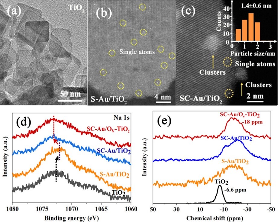 (a) TiO2的TEM图像; (b, c) S-Au/TiO2(b)和SC-Au/TiO2(c)的HAADF-STEM图像。(d) TiO2,S-Au/TiO2,SC-Au/TiO2和SC-Au/Ov-TiO2的XPS光谱。(e) TiO2,S-Au/TiO2,SC-Au/TiO2和SC-Au/Ov-TiO2的23Na NMR光谱。