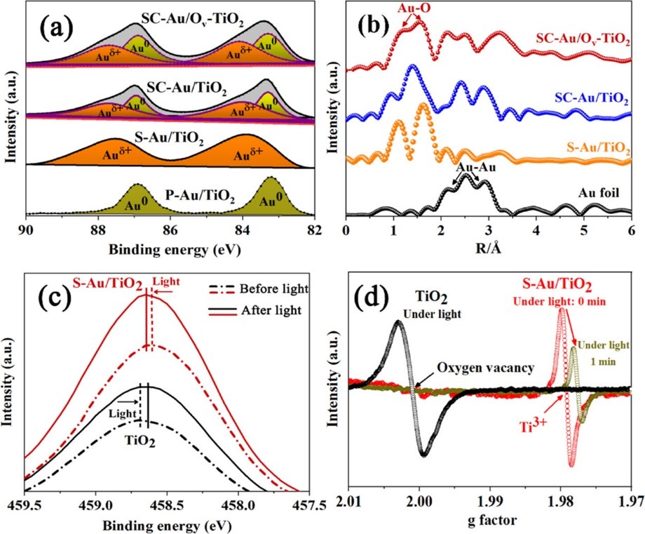 (a) S-Au/TiO2,SC-Au/TiO2,SC-Au/Ov-TiO2和P-Au/TiO2参照的Au 4f XPS光谱; (b) S-Au/TiO2,SC-Au/TiO2,SC-Au/Ov-TiO2和Au箔的傅里叶变换(FT)Au L3-edge(k);(c)光照下的TiO2和S-Au/TiO2原位Ti 2p XPS光谱; (d)光照下TiO2和S-Au/TiO2的准原位ESR光谱。©2023 JACS