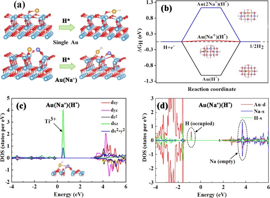 (a) Au单原子和Au(Na+)组装体氢吸附构型的局部原子结构 (b) 引入一个Na+可以显著降低产氢的ΔGH。(c) Au(Na+)(H*)中Au-O键周围Ti的DOS图。(d) Au(Na+)(H*)中Au、Na和H的DOS图。