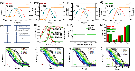 此外,基于上述实验,我们又对两组材料进行了系统的光物理实验表征,其中能量损耗实验表明:随着氯原子增多,全聚合物器件的能量损耗增大,主要由于骨架振动态增多导致非辐射符合增加,而对于小分子受体则是相反的趋势。激子扩散实验中,随着氟原子增加,氟代聚合物表现出更加长的激子扩散距离,这有利于电荷转移以及分离,以上结果也和形貌GIWAXS表征的结果一致。