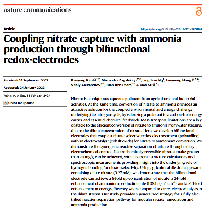 近日,伊利诺伊大学香槟分校Xiao Su等人报道了一种双功能电极(PANI-Co3O4/CNT),这种双功能电极由具有高选择性氧化还原电化学吸附硝酸盐功能的聚苯胺(PANI)和氧化钴电催化剂组成,通过电化学方式实现硝酸盐的协同反应分离。相关的研究成果以“Coupling nitrate capture with ammonia production through bifunctional redox-electrodes”为题发表在Nature Communications上。